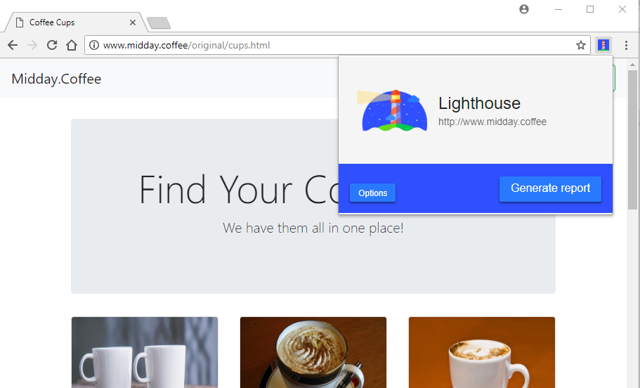 3. Load the page that you want to test. We created a small demo page with and without lazy loading. URL of the original demo page is www.midday.coffee/original/cups.html